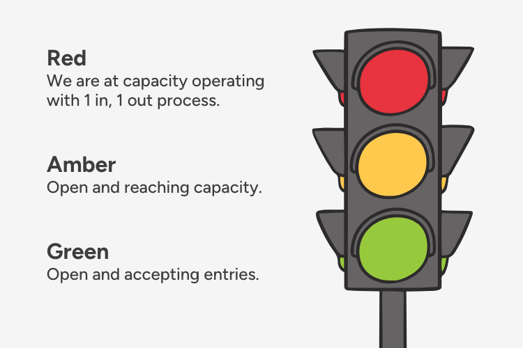 Red – we are currently at capacity and operating with 1 in, 1 out processes